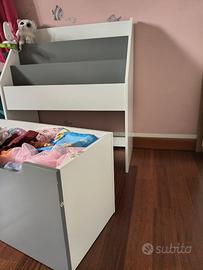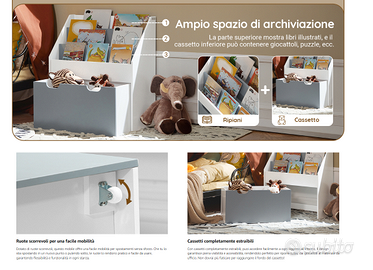 Libreria montessoriana per bambini con cassetto su ruote.