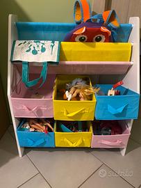Bellissima libreria per bambini piccoli 12 mesi - 5 anni per organizzare il materiale e mettere i libri con tutta la copertina a vista (stile Montessori). Materiale: legno bianco, viti metalliche e stoffa colorata. Due ripiani in stoffa (azzurro e giallo) per libri, borse o zainetti e sei cassetti multiuso.