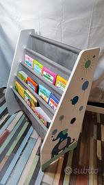 Vendo libreria porta libri per bambini con struttura bianca e tasche in tessuto grigio, perfetta per tenere i libri sempre in ordine e alla portata dei bambini.
