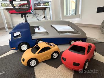 Un robusto camion a due piani per il trasporto delle auto. La motrice indipendente può essere staccata dal rimorchio. Una sponda ribaltabile per la salita e discesa delle auto, due rampe indipendenti e due macchinine coupé, completano il gioco. Date le grandi dimensioni è adatto all'utilizzo sia in luoghi chiusi che all'aperto.