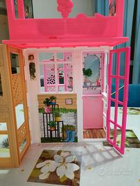 Casa di Barbie (loft) completamente ammobiliata con 2 piani e 4 aree di gioco. Le aree di gioco includono un letto a soppalco, il bagno, la cucina e la sala da pranzo. Completa di un tavolino con due sedie e una coperta / tappeto. Si richiude per essere facilmente trasportata e da chiusa occupa 17x31x47 cm Condizioni molto buone, segnalo solo una sedia con una zampa leggermente storta, un adesivo rovinato e alcuni attaccati un po' storti