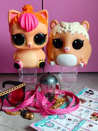 LoL Surprise grande lotto composto da due Biggie Pet e 5 bambole lol Surprise. Il lotto si compone di 2 piccole lol surprise, Treasure e Nightfall; il Biggie Pet Swag; il Biggie Pet Neon; due bambole lol Surprise Tweens Cherry BB e Marilyn Star; Omg Major Lady. Tutti i personaggi sono giocati, ma in buono stato e accessoriati come visibile in foto.