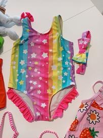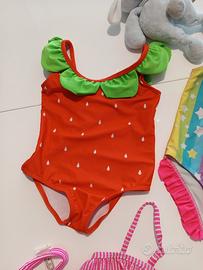 Bellissimi costumi da bagno per bambina, perfetti per l'estate! Il lotto comprende 4 costumi, due a tema fragola e due con fantasie a righe e stelle. Sono in ottime condizioni, pronti per essere indossati. Taglia 18/24 mesi (90 cm). Due hanno anche le relative fascette (mai indossate).