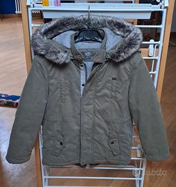 - Giacca invernale verde militare con cappuccio e pelliccia. Il cappuccio è staccabile e la pelliccia può essere staccata dal cappuccio. Si può stringere in vita. Chiusura con cerniera e bottoni a pressione. (74% cotone e 26% poliammide).