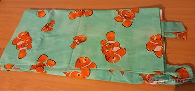 lotto di 6 accessori originali per cameretta targati Nemo Disney Pixar, comprende il simpatico pouf portagiochi , le tre scatole , il morbido cuscino stampato 40x40 , la tenda arredo colore azzurro 100% cotone con passanti ( mis. 140x290 ) rifinita e già pronta per essere montata direttamente sul bastone, di lunghezza regolabile con termoadesivo