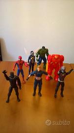 Descrivo gli oggetti in vendita seguendo l’ordine delle foto pubblicate. - Spiderman parlante grande (40 centimetri), come nuovo. - 7 supereroi, altezza 30 centimetri, come nuovi, salvo uno che ha una piccola rottura. - Supereroi medio/piccoli e accessori vari, come nuovi. NON POSSO SPEDIRE MA POSSO CONSEGNARE A MILANO E PISTOIA.