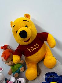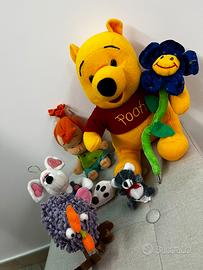 Set di 6 peluche composto da: 1 orso grande di Winnie The Pooh; 1 peluche di Ciottolina d cartoon 'Gli antenati Flintstones'; 1 topolino con cuore rosa simile al Diddl con gancio per appenderlo; 1 fiore blu con ramo modificabile; 1 gallina viola con le zampette di legno un po' rovinate (in omaggio); un piccolo topolino grigio.