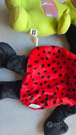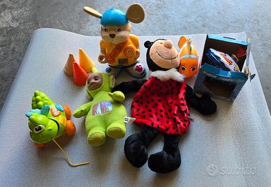 Vendo lotto di giocattoli per bambini, usato ma in buone condizioni. Include: un peluche coccinella, un pupazzo Teletubbies, un pesce e un drago giocattolo interattivo con lettere e numeri, un topo musicale e coni colorati, più un trottola musicale.