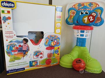 Canestro Chicco Basket League, il canestro riconosce il passaggio della palla e conta i punti con effetti luminosi e musicali, altezza regolabile fino a 58 cm.