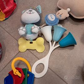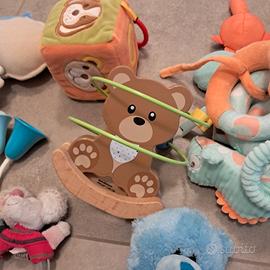 Vari giochi tra cui un serpente da attaccare al passeggino, un orsetto con perle che scorrono, un dado.......