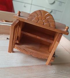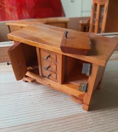 Lotto 11 pezzi mobili vintage casa delle bambole di legno con dettagli di ferro (pomelli e cerniere) e plastica. L'armadio è alto circa 12 cm.