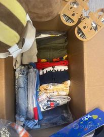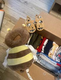 Scatolone neonato primaverile Lo scatolone è composto da: Magliette Pantaloni tuta Pantaloni corti e lunghi Felpe Pigiami Salopette Tutine Pagliaccetti Sandali (di bellezza leggeri) Cuscino anti caduta Pantofole Calzini Body Maglioncino Cappelli (per il sole estivi) (ogni pantalone ha la sua felpa o la sua maglietta senza cose a caso e non abbinabili)