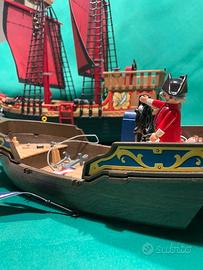 Settore Pirati: 1 Grande Nave con vele rosse e alberi integri. 1 Scafo di una seconda nave pirata (mancante di albero). Inclusi pirati, cannoni e accessori vari.