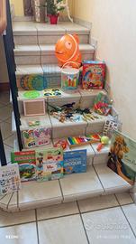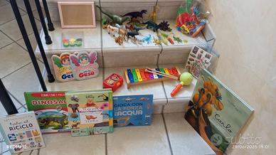 contenitori per giocattoli completi di tutto quello che vedete in foto (tranne la scatola arancione e la stufa 😅) tutto in ottime condizioni. xilofono, formine, dinosauri, mattoncini di legno, nemo, libri ecc
