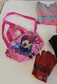 Lotto stock abbigliamento bambina 5/6 anni in perfette condizioni. Include: - 1 borsetta - 1 maglietta termica - 1 maglietta manica corta - 1 leggins bianco - 2 short - 1 cardigan - 1 paio di guanti
