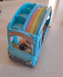 3 veicoli originali: Camper crema, Bus arcobaleno, Pulmino blu