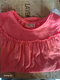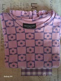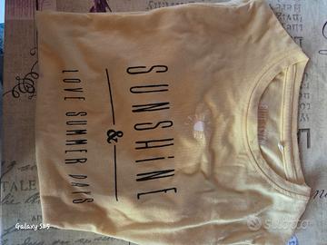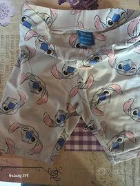 Lotto di vestiti per bambina in taglia 140cm 9-10 anni - Pantaloncini lilla H&M - T-shirt gialla con stampa Sunshine & Love Summer Days Blu Seven - T-shirt rosa corallo con volant OVS - Pantaloncini con stampa di Stitch Disney - Maglietta rosa con fantasia geometrica Destination