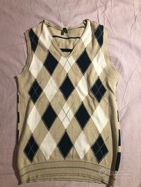 Pantaloni blu scuro Polo by Ralph Loren, magliocino nero con scollo a v di Zara man, gilet a losanghe panna, beige e blu della Benetton, camicia azzurra di Idexe, cintura.