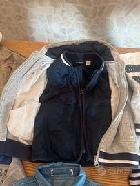 Comprende:felpa beige con Pelo all'interno,felpa grigia doppia con smanicato blu,3 maglioncini(1 blu,1nero e grigio a righe,1grigio)felpa grigia con inserti blu e gialli,camicia di jeans con maglietta a maniche corte grigia,camicia a maniche corte bianca con righe blu,polo a manica lunga blu e un paio di jeans. Tutto in buone condizioni.