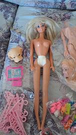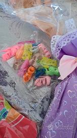 lotto che comprende vestiti , scarpe e accessori per bambole, vanno bene per le barbie o similari due barbie più u a bambola simil barbie. vestiti e accessori sono nuovi