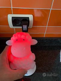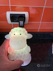 Luce notturna con base di ricarica. La lampada si accende automaticamente quando la si solleva dalla base di ricarica. Emette una luce soffice e fluorescente che non disturba il sonno del bambino.