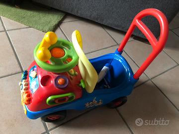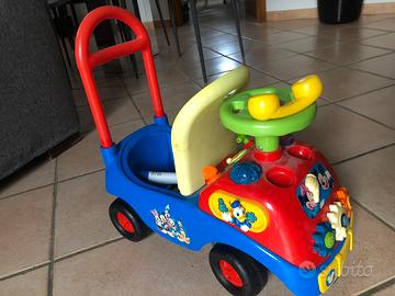 Macchina cavalcabile con schienale Walt Disney con Paperino e Topolino. Ci sono suoni, giochi tattili, clacson, telefono. È presente un vano porta oggetti sotto il sedile. Ruote perfettamente girevoli. Bellissima.