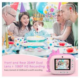 [Fotocamera digitale da 20 MP con due lenti per bambini] Questa HiMont Macchina Fotografica Bambini istantanea è dotata di doppi obiettivi da 20 MP sul davanti e sul retro, che può scattare foto e video sempre e ovunque anche quando non c'è carta da stampa. Nell'ambito delle funzioni di foto e video, le immagini a colori ad alta risoluzione e i video 1080P vengono salvati automaticamente sulla scheda di memoria 32G. Inoltre dispone di una funzione zoom digitale 10x. (scheda TF 32G inclusa)