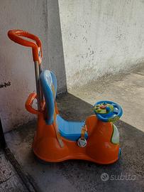 Macchinina adattabile all'età, con supporti e cinturina per i più piccoli, maniglione di spinta per i genitori.