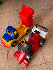 Giocattolo macchina sportiva a spinta e cavalcabile, con volante e vano portaoggetti, in plastica resistente, cm. 65x33x38 H, anni 1-4 anni + camion giocattolo con casdobe ribaltabile in plastica redtente, cm 70x33x40H, età 1-4anni