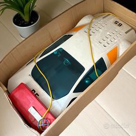 Il set include l'auto in plastica bianca con dettagli arancioni e vetri fumé, e il suo telecomando originale a filo (rosso con cavo giallo). La scatola originale, sebbene mostri i segni del tempo, dell'usura e delle pieghe, è presente e aggiunge un valore significativo all'oggetto, conservando le illustrazioni e i dettagli del marchio Polistil ("Made in Italy"). L'auto presenta i numeri "69" sul lato.