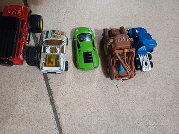 Nove macchinine giocattolo varie, alcune più nuove, altre più vecchie, una a carica (il fuoristrada rosso).