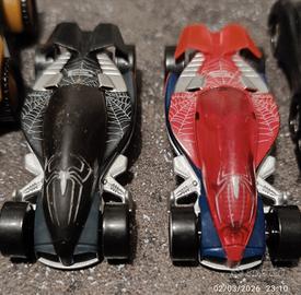 La collezione include veicoli ispirati ai personaggi Marvel, con dettagli specifici come ragnatele e colori tematici.