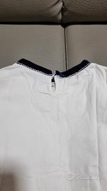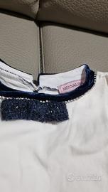Maglia manica lunga cotone bianca Monnalisa con fiocco blu, colletto alla coreana di velluto e brillantini.