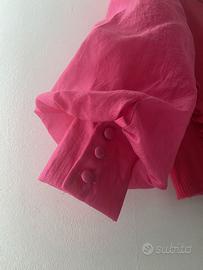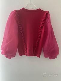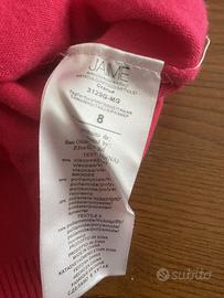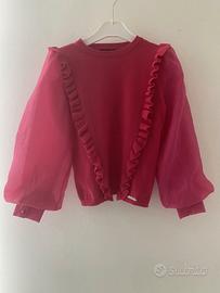 Vendo per cambio taglia ma in ottime condizioni questa sfiziosa maglia bimba J'AIME', taglia 8 anni, color magenta. Con piccoli volant sia davanti che dietro e eleganti maniche lunghe a palloncino con polsini a 3 bottoni in tessuto.