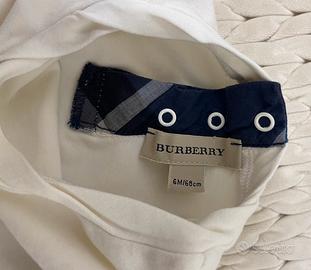 Maglietta neonato originale e nuova. Bianca con classico motivo a quadri Burberry e toppe sulle maniche blu. Taglia 6 mesi
