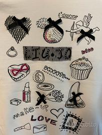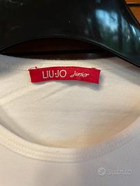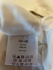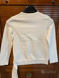 Maglia a maniche lunghe Liu Jo junior per bambina, di colore bianco, con stampe, scritte, paillettes e perle. Ha un nastro laterale che si può legare a fiocco. Taglia 8 anni, come nuova