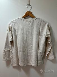 Vendo t-shirt a maniche lunghe color panna di Zara Kids, collezione Peanuts. Il capo presenta una stampa frontale colorata con tutti i personaggi iconici di Snoopy. Il taglio della maglietta è leggermente oversize.