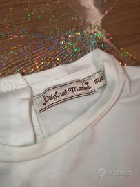 Vendesi deliziosa maglietta a maniche lunghe firmata Original Marines per bambina, taglia 18/24 mesi. Il capo è di colore bianco panna e presenta un'originale grafica frontale in rilievo: Dettagli preziosi: Applicazione a forma di cappellino con trama a quadri (stile scozzese) e un elegante fiocco dorato. Grafica: Una simpatica bimba "detective" con lente d'ingrandimento impreziosita da strass luminosi. Praticità: Apertura sulla schiena con bottone a pressione per facilitare la vestizione. Stato del capo: La maglia è in ottime condizioni generali, il tessuto è morbido e le stampe sono perfettamente integre. Come visibile dalle foto, sono presenti solo lievissimi e normali segni d'uso, ma non ci sono macchie evidenti o strappi. Dettagli tecnici: Marca: Original Marines Taglia: 18/24 mesi Colore: Bianco con inserti colorati Materiale: Cotone elasticizzato di alta qualità