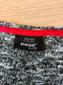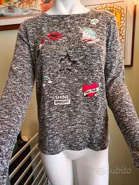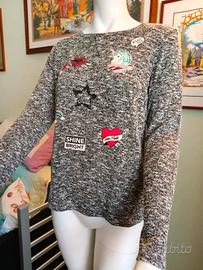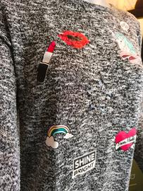 Maglietta ragazza grigio mélange mezza stagione, con piccole applicazioni colorate (arcobaleno 🌈, rossetto 💄, unicorno 🦄, ecc ) più alcune con paillettes. Girocollo, maniche lunghe, in tessuto misto, elasticizzato e fondo lievemente arrotondato. Tg 158-164 pari a una tg S da donna, come si vede dalle foto sul manichino. Spalle cm 40, ascelle cm 49, lunghezza cm 60. Usato eccellente, senza difetti. Page One Young.
