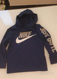 Maglietta blu a maniche lunghe con cappuccio marca Nike. Scritta Nike davanti e scritta sul braccio. taglia 3/4 anni 98-104cm