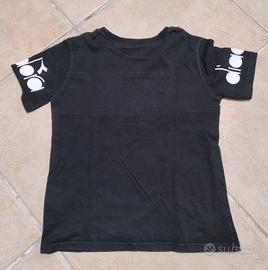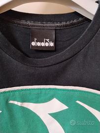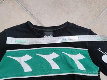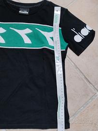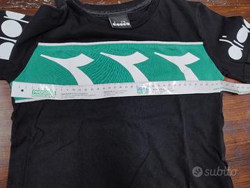 Vendo bellissima t-shirt Diadora originale a maniche corte, colore nero con banda verde e loghi bianchi. Design sportivo e grintoso, perfetta per la scuola, il calcetto o il tempo libero. CARATTERISTICHE: Marca: Diadora Colore: Nero e Verde Stato: Ottime condizioni, tessuto resistente e stampe integre. Taglia: L'etichetta interna è presente ma sbiadita dal lavaggio. Metro alla mano, la maglia veste una taglia 7-8 anni (altezza circa 122-128 cm). MISURE PRECISE (prese in piano): Larghezza (da ascella ad ascella): 37 cm Spalle (da cucitura a cucitura): 32 cm Lunghezza (dalla spalla al bordo inferiore): 47 cm