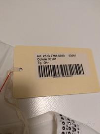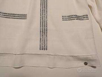 Maglietta girocollo elegante Miss Grant per bambina, maniche lunghe, con brillantini applicati, costituita da due strati il primo leggero in poliestere e il secondo 95% cotone 5% elastan, con balza in fondo. Chiusura con automatico di dietro. Taglia 7/8 anni (122-128 cm). Nuova con cartellino.