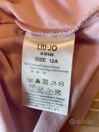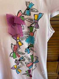 T-shirt/maglia a maniche corte Liu Jo junior per ragazza/bambina. Di colore lilla, con stampa colorata con fiocchi e un fiocco viola in tulle, con paillettes. 100% cotone, taglia 12 anni. Manca l’etichetta sulla maglia e ha uno strappo leggero all’altezza della spalla destra (vedere foto)