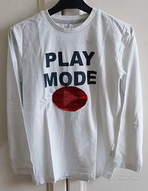 Maglietta bianca a maniche lunghe con stampa. - Scritta PLAY MODE in nero. - Patch a forma di play con paillettes verdi e bianche reversibili.