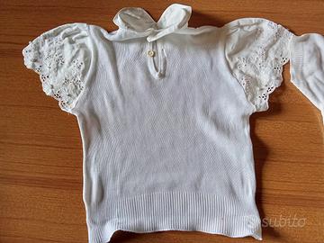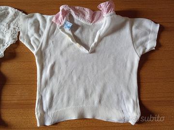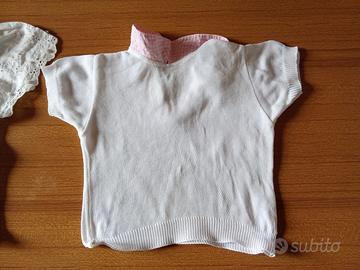 Vendo due magliettine per bambine a mezze maniche, cotone. Dimensioni quella col colletto a scacchi rosa da spalla a spalla 23 cm, lungo 28. Quella tutta bianca da spalla a spalla 21 cm, lungo 30 cm. Vendo anche separatamente