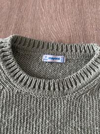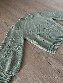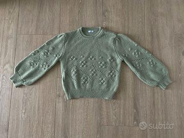 Maglioncino color verde menta per bambina Mayoral. Presenta applicazioni a forma di fiorellini in rilievo e dettagli traforati sulle maniche. - Maniche lunghe con polsini. - Scollo rotondo. - Fondo a costine. Taglia 12 anni (152 cm). Ottime condizioni.