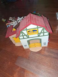 Maneggio Playmobil con animali, stalle, recinti. il set include più accessori dell'originale: 6 cavalli, 5 personaggi, 2 pony. Ci sono 2 stalle chiudibili con chiavistello, staccionate per costruire il recinto in diversi modi, una scala per l'accesso al fienile e di tanti ganci e ripostigli per gli accessori di cura dei cavalli
