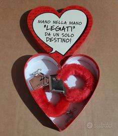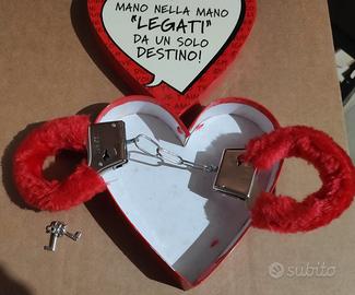 Come da foto, manette scherzose con peluche rosso in confezione a forma di cuore.