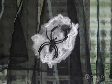 Descrizione: Mantellina di velo nero, trasparente e traslucido (tipo velo di seta), con collo alto, piuttosto rigido e di spessore, rialzabile ed intagliato al margine con motivo ad “ali di pipistrello” (come pure l’orlo, sul fondo della stessa mantellina), chiuso sul davanti da due lunghi lacci neri, per poter essere poi posizionato sia rialzato con “fasciatura” del collo; oppure, abbassato sulle spalle. Questa mantellina presenta, inoltre, alcuni motivi decorativi di ragnatele argentate, dipinte a mano sul davanti; ed una ulteriore decorazione artigianale applicata (ragnatela in fibra sintetica bianca ed un grosso ragno nero di plastica), cucita al centro sulla stessa (in fondo, a destra) per mascherare un precedente rammendo lungo mm. 20. Trattasi, quindi, di un pezzo unico perché dipinto con alcuni interventi a mano, ma anche perché arricchito e valorizzato dall'applicazione sartoriale della ragnatela sintetica con grosso ragno nero, come capo ricondizionato.
