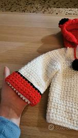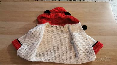 Vendo mantellina realizzata a mano all'uncinetto per neonato da 3 a 6 mesi. Il capo è realizzato con 100% lana merinos di altissima qualità, molto morbida, non pungente, anallergica ed irrestringibile. Il capo riprende le sembianze di una volpe con i colori rosso e nero e con le orecchie cucite sul cappuccio.